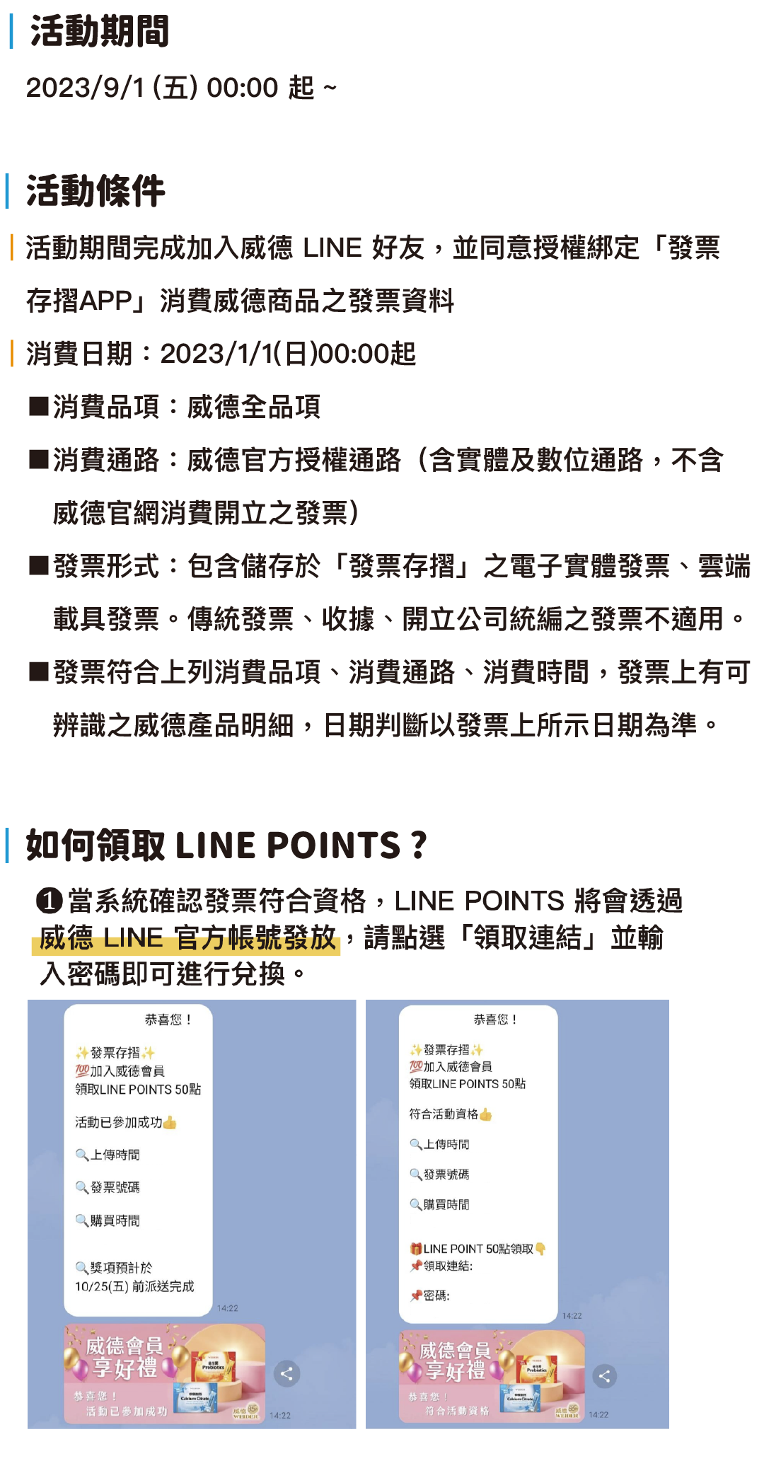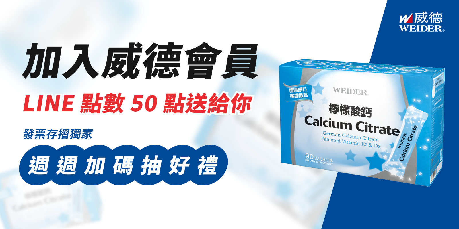 ☑️您已完成好友加入,等候獎勵發放中☑️ 登入威德會員並完成綁定發票資料,領取 LINEPOINTS 50 元購物金,還可累積消費,再享威幣點數回饋! 3月符合活動資格者,將於2024/4/20(六)前,由威德官方LINE及E-mail完成自動派獎。 2月符合活動資格者,將於2024/3/20(二)前,由威德官方LINE及E-mail完成自動派獎。 1月符合活動資格者,將於2024/2/27(三)前,由威德官方LINE及E-mail完成自動派獎。 (獎品數量有限,贈完為止,每位威德會員限領取乙次) 【發票存摺獨家抽】 加碼抽活動請至[發票存摺官網](https://invoice.tw/news/?p=9006)活動頁面查看 【活動資格說明】 ※威德官網會員 ※活動期間同意授權綁定「發票存摺APP」消費威德商品之發票資料 ※發票資料 ■消費日期:2023/1/1(日)00:00起 ■消費品項:威德全品項(不包含威德 in 果凍系列) ■消費通路:好市多股份有限公司(含實體及數位通路,不含威德官網消費開立之發票) ■發票形式:包含儲存於「發票存摺」之電子實體發票、雲端載具發票。傳統發票、收據、開立公司統編之發票不適用。 ■發票符合上列消費品項、消費通路、消費時間,發票上有可辨識之威德產品明細,日期判斷以發票上所示日期為準。 【獎項說明】 ■符合活動資格者,主辦單位將派獎時間前寄送兌換序號將由「威德官方LINE」及「E-mail」派獎,請密切鎖定,並依照儲值方式自行將點數使用。 ■獎項發送及公告日期如遇不可抗力因素致無法作業或公告時,主辦單位將於該不可抗力因素消滅後辦理。 ■參加者所提供資料將作為贈獎用,若由於封鎖威德官方LINE,或會員E-mail資料填寫有誤、不完整、無法辨識或虛構等個人因素,導致派獎失敗或其他相關問題,則視同放棄。 ■數位獎項之「領取時間」及「兌換使用期限」將隨派獎訊息一併發送,請依訊息內容,於期限內自行儲值使用,逾期未兌換視同放棄,不得要求主辦單位重新提供。 ■本活動獎項點數之使用期限及方式,悉依發行商之規定,詳細內容依發行商官方公告為準。本活動獎項經主辦單位寄出後,後續由得獎者自行負責保管,恕主辦單位一概不負任何責任,敬請見諒。 ■本活動獎品不得要求轉換、轉讓或折換現金。 ■本活動獎品悉以電子儲值序號為準,如遇缺貨或不可抗力之因素無法提供時,主辦單位有權以其他等值商品替代。 ■主辦單位非獎品製造者或提供者,且與獎品或服務之提供廠商無任何代理或合夥關係。如因本活動獎品或服務發生任何爭議,與主辦單位無涉。中獎者須遵守獎項供應商所列有關獎項之各項條款及細則,如有相關使用疑問,請洽獎項供應商,主辦單位對所有領取或使用獎項之事宜,概不負責。 ■儲值金操作方式[(點擊查看)](https://points.line.me/pointcode#/pointcode/form) 【威德客服】 ●本活動由 WEIDER 威德(福又達生物科技股份有限公司) 發起,針對活動如有疑問請來電客服專線。 ●客服專線:0800-009-181 ●服務時間:周一~周五,09:00-12:30/13:30-18:00,例假日及國定假日暫不提供服務 【活動注意事項】 ■本活動每位威德會員僅限參加1次,贈品1人限領1份。贈品數量有限,送完為止。 ■參加者於參與本活動之同時,即表示同意接受本活動之活動辦法與注意事項之規範;如有違反,主辦單位得取消其中獎資格,並對於任何破壞本活動之行為保留法律追訴權。 ■主辦單位有權檢視各活動參加者之參與行為及中獎情形是否涉嫌不法或有違常理之異常狀況,例如:人為操作蓄意偽造、短時間異常多筆參與行為、透過任何電腦程式參與活動、詐欺或以任何其他不正當的方式意圖以進行不實或虛偽活動參與行為、或登錄資料不實或不正確或盜用任何第三人之資料,或有違反活動規範之行為等。活動參加者因上述情形所獲得之活動獎項與威幣點數回饋,主辦單位保有變更、終止參加活動資格、取消中獎資格或暫停活動的權利,並保留法律追訴權。 ■主辦單位擁有取消、變更或解釋活動內容之權利。如有任何爭議,以公佈於本活動辦法網頁上的資料為準,無須事前通知,主辦單位有權對本活動所有事宜作出解釋或裁決。 ■如有任何因網路、電子產品(包括但不限於任何其他得登入本活動參與抽獎之電子產品。例如:電腦、IPAD、手機)、技術或不可歸責於主辦單位之事由,而使參加者所登錄之資料有延遲、遺失、錯誤、無法辨識或毀損之情況,主辦單位不負任何法律責任,參加者亦不得因此異議。 ■所有參加本活動者於提供或填寫個人資料後,視為同意主辦單位、活動執行單位得將其個人資料於本活動目地範圍內蒐集、處理暨使用之。主辦單位僅使用參加者所提供之個人資料於此次活動用途,且遵守【個人資料保護法】相關規定,以維護參加者權益。詳細告知內容請參閱以下個人資料告知事項暨同意書。 ■本活動參加者同意所留存或產生之活動的資料及記錄,皆以主辦單位之電腦系統與時間之記錄為主。如有任何因電腦、網路、電話、技術、不可抗力因素或其他不可歸責於主辦單位之事由,致參加者所傳輸資料有失敗、延遲、遺失、錯誤、無法辨識或毀損等情況,主辦單位不負擔任何法律責任,參加者不得因此異議。 【活動注意事項】 1.參加者於參與本活動之同時,即表示同意接受本活動之活動辦法與注意事項之規範;如有違反,主辦單位得取消其中獎資格,並對於任何破壞本活動之行為保留法律追訴權。 2.參加者保證