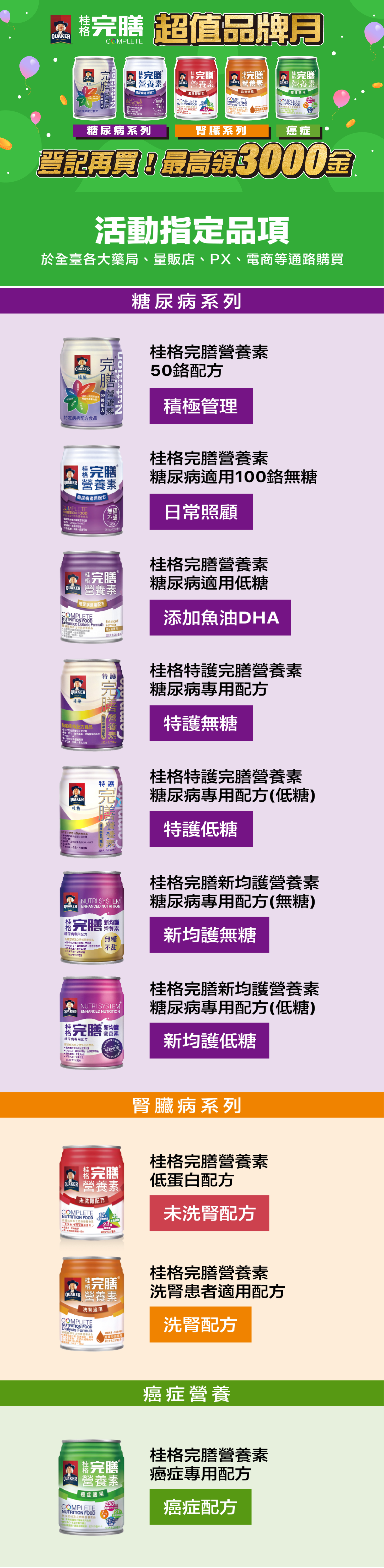 好康快看!桂格完膳超值品牌月,省錢大攻略! 即日起至 2024/6/30 於全台任一門市購買「桂格完膳」即飲營養品(糖尿病/腎臟/癌症系列限定)達到指定金額,並將發票存入「發票存摺 APP」,即可領取最高 3000 金幣回饋,並可至發票存摺「商城」兌換 300 元量販購物金!名額有限,要買要快! ▊活動時間 2024/3/1 ~ 2024/6/30 ▊活動方式 ❶ 立即點選下方按鈕登記 ❷ 活動期間內於全聯、各大藥局、momo購物網、家樂福、大潤發、愛買、屈臣氏...等有開立電子發票之店家,購買「桂格完膳」即飲營養品(糖尿病/腎臟/癌症系列限定),達到指定金額,存入發票即可領取金幣獎勵 ▊指定金額與獎勵 ❶ 滿 1000 元回饋 3000 金幣與 300 元量販購物金商城好禮兌換資格(首次購買限定) 立即填寫下方表單,送出系統會立即為您保留活動名額 ⬇️ (⚠️ 注意:此步驟僅替您保留名額❗️請於活動期間內購買指定商品達到指定金額,並將消費發票存入「發票存摺 APP」,即可領獎)