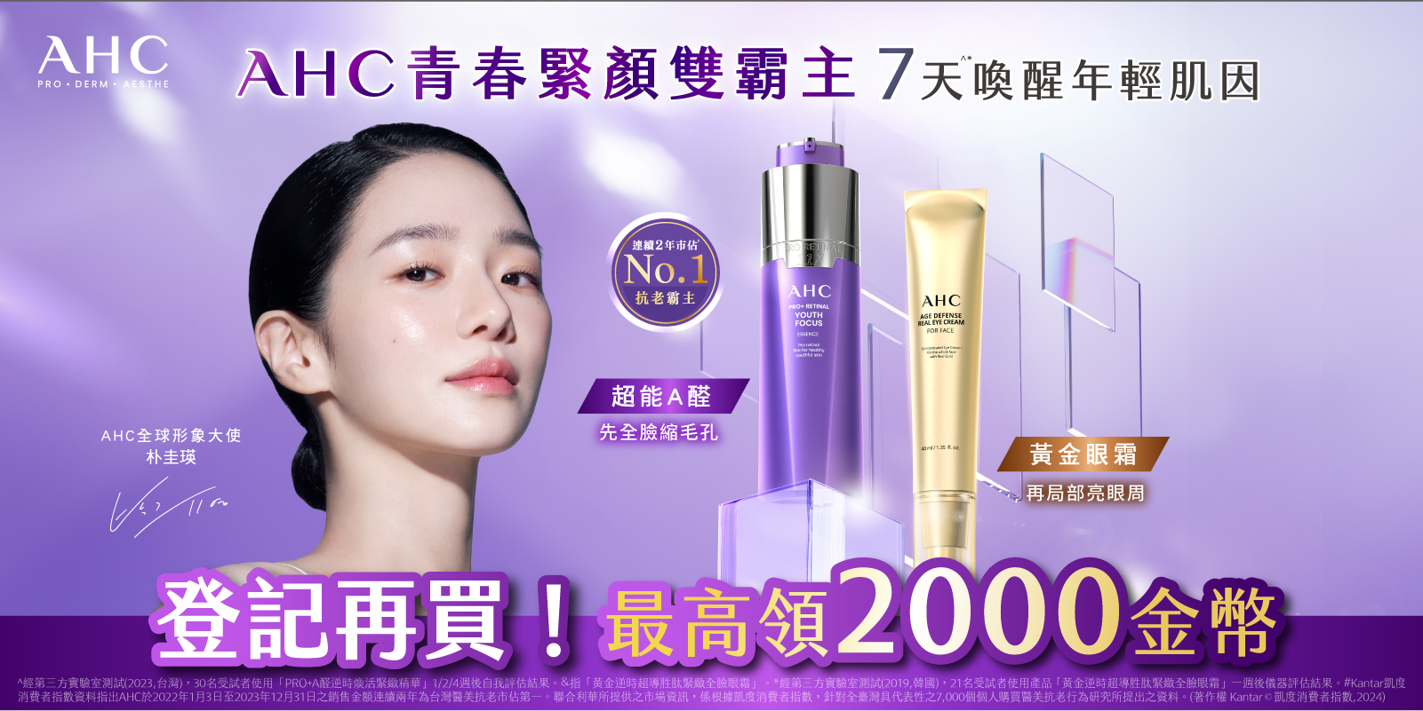立即登記保留名額!請於活動期間內於官方通路購買「AHC」活動品項達指定金額,並將消費發票存入「發票存摺 APP」,即可獲得最高發票存摺 2000 金幣!